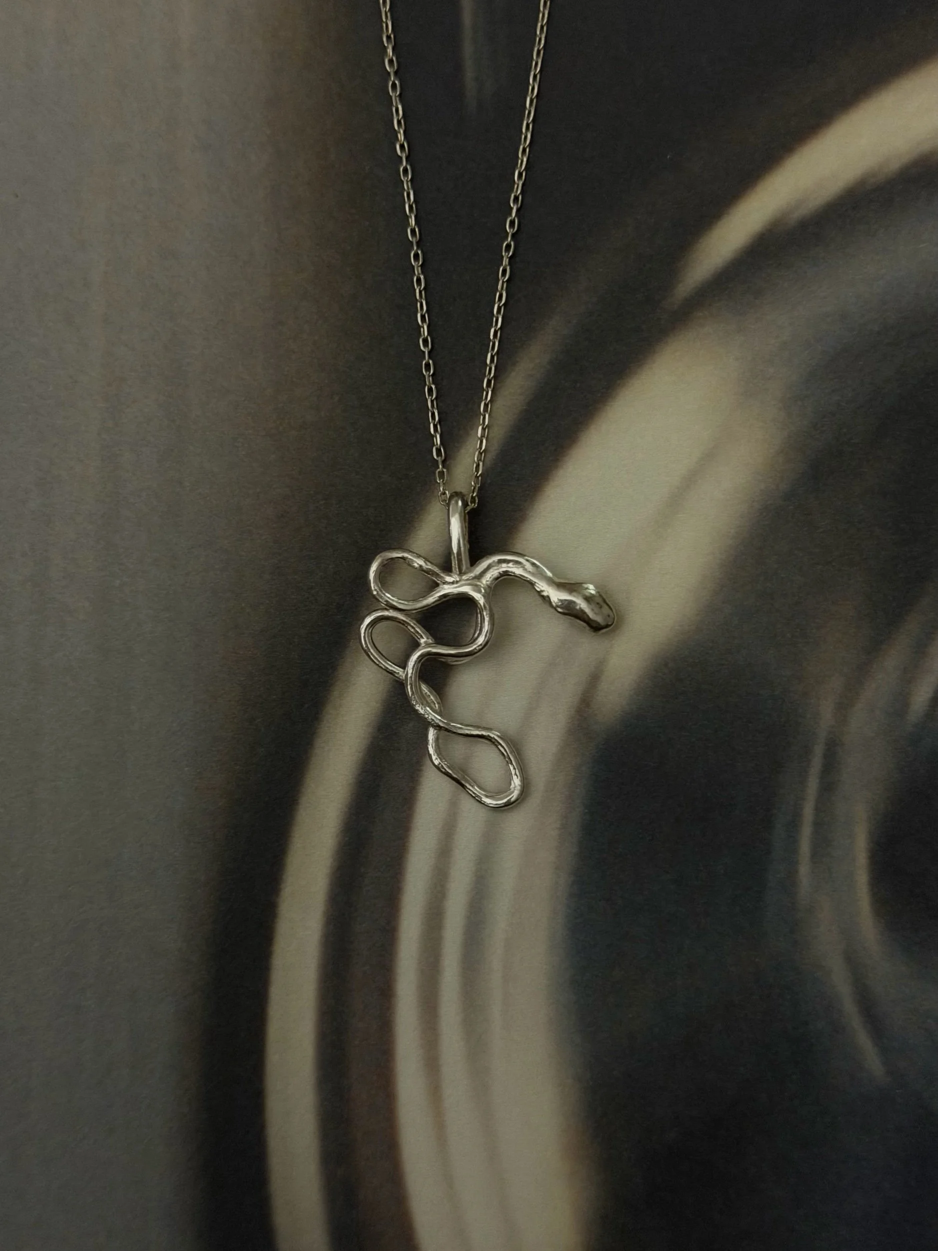 This organic pendant was discovered through heat and movement experimentation. An instinctive curve took shape, almost serpent-like in its form.
